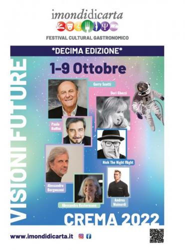 I Mondi di Carta torna a illuminare la città del Torrazzo con gli ospiti della decima edizione del festival: da Gerry Scotti a Alessandro Bergonzoni, da Luciano Fontana a Marco Tarquinio fino a Dori Ghezzi e Paolo Ruffini. Per questo compleanno speciale, la kermesse cremasca racconta le “Visioni Future” proiettandoci nel 2030: si parlerà di musica, cinema, teatro, storia, editoria, cucina, salute delle persone e del pianeta per rispondere a una domanda: in che mondo e città vivremo fra 10 anni?