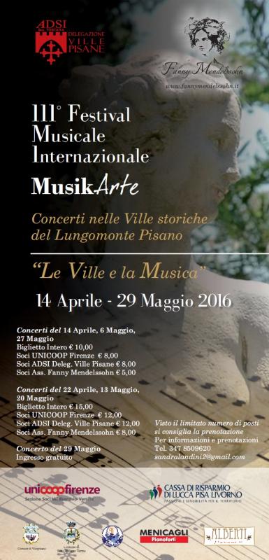 Ai nastri di partenza la III Stagione Concertistica con il patrocinio del Comune di San Giuliano Terme e del comune di Vicopisano nata dal desiderio dell’associazione musicale Fanny Mendelssohn di percorrere nuove strade, con l’intento di riunire per questa edizione non solo la musica ma anche l’arte e la bellezza delle straordinarie dimore storiche del Lungomonte Pisano in un Festival itinerante dal titolo MusikArte.