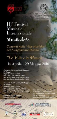 Ricordiamo che il Festival MusikArte è stato creato sotto la direzione artistica dell’associazione musicale Fanny Mendelssohn con la ADSI delegazione Ville Pisane grazie al contributo della UNICOOP FIRENZE sezione Soci Valdiserchio –Versilia e della Cassa Di Risparmio Lucca Pisa Livorno.
