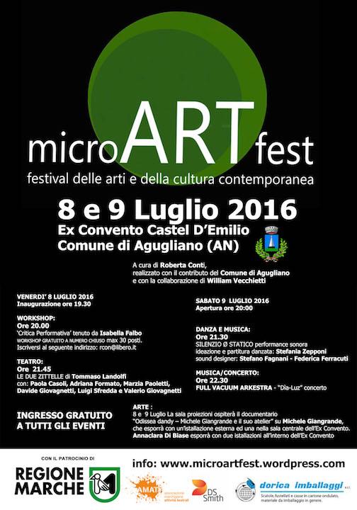 La seconda edizione di microARTfest si svolgerà l’8 e il 9 luglio 2016 dalle 20.00 sempre presso la suggestiva location dell’Ex Convento di Castel d’Emilio del Comune di Agugliano (Ancona). Visto il gradimento della scorsa edizione, il festival ripropone un approfondimento sull’arte e la cultura contemporanea percorrendo le varie discipline con diversi eventi. MicroARTfest è a cura di Roberta Conti ed è realizzato con il contributo del Comune di Agugliano e con la collaborazione di William Vecchietti.