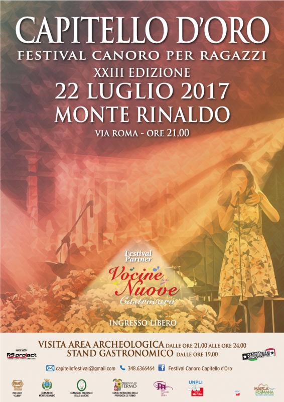Com’è consuetudine torna sabato a Monte Rinaldo uno degli appuntamenti storici dell’estate: il “Capitello d’oro”. Il Festival canoro per bambini e ragazzi, giunto quest’anno alla XXIII edizione, si svolgerà sabato 22 Luglio a partire dalle ore 21:00 in Via Roma a Monte Rinaldo.