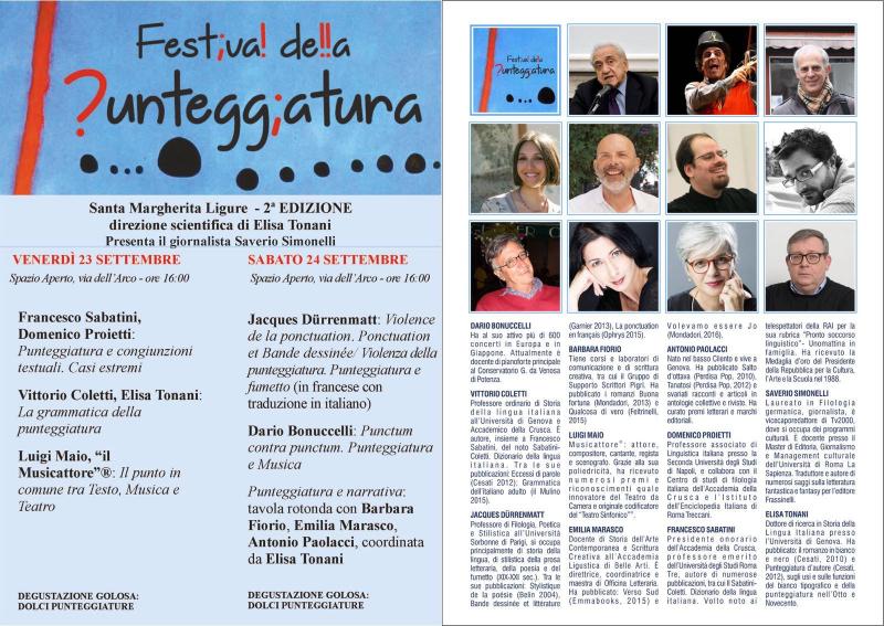 Dopo il successo della scorsa prima edizione, ritorna l’unico Festival della Punteggiatura italiano, a Santa Margherita Ligure (Spazio Aperto, via dell’Arco), venerdì 23 e sabato 24 settembre (data scelta non a caso visto che il 24 settembre è anche la ricorrenza annuale del National Punctuation Day americano).