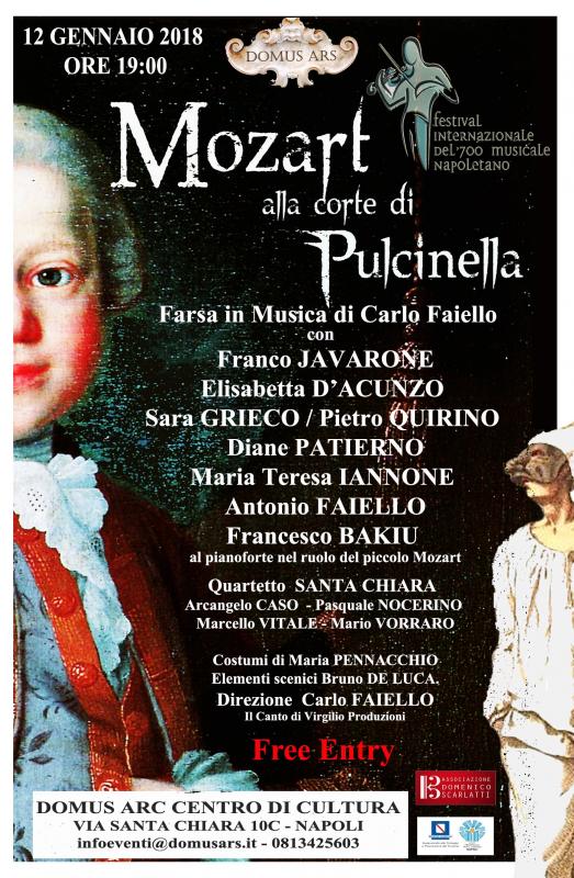 Il Festival Internazionale del ‘700 Musicale Napoletano è giunto quest’anno alla XVIII edizione grazie all’impegno e alla cura dell’Associazione Domenico Scarlatti (che quest’anno festeggia i suoi 35 anni di attività) e all’associazione Il Canto di Virgilio. La manifestazione si svolge a Napoli dal 10 al 14 gennaio 2018 venerdì 12 Gennaio ore 19,00 alla Domus Ars la farsa in musica “Mozart alla corte di Pulcinella di via Santa Chiara, 10 prodotto dell’associazione Il canto di Virgilio.