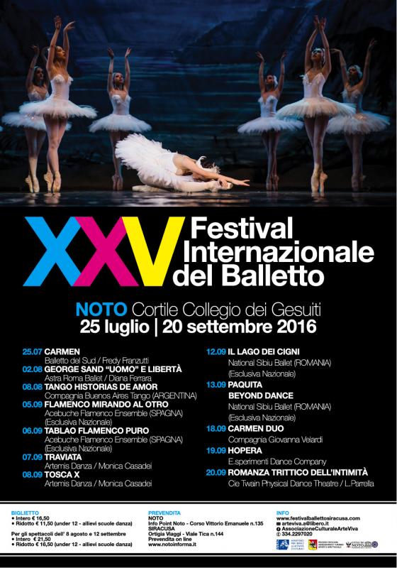 Per queste speciali nozze d’argento la location è d’eccezione, quest’anno infatti il Festival avrà luogo a Noto, centro storico barocco, stupendo giardino di pietra, dichiarato dall’Unesco “Patrimonio dell’Umanità”, all’interno del Cortile del Collegio dei Gesuiti. Un’edizione speciale, quindi, con un programma di elevato livello qualitativo distribuito tra i mesi di Luglio, Agosto e Settembre, con dodici spettacoli in cartellone, attentamente selezionati dai curatori artistici della rassegna con l’intento sia di riprendere la tradizione della grande danse sia di rappresentare i canoni emergenti della danza contemporanea.