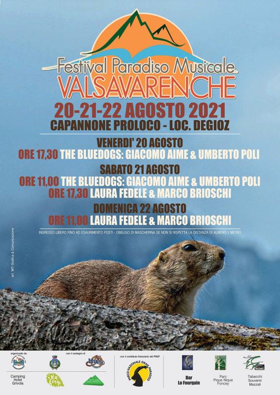 Per la 7° edizione del Festival Paradiso Musicale a Valsavarenche (AO) – 20-22 agosto 2021 – si esibiranno The Bluedogs, Giacomo Aime e Umberto Poli, e il duo composto da Laura Fedele e Marco Brioschi, anche quest’anno avremo un’edizione più intima nel rispetto delle norme e dei regolamenti sanitari, sempre immersi in una delle più belle ed incontaminate oasi naturalistiche delle nostre Alpi.