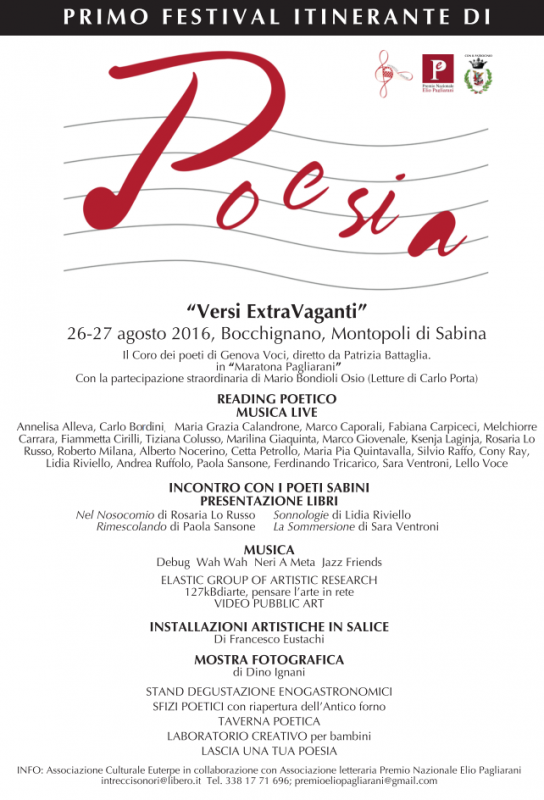 Il 26 ed il 27 agosto 2016 nel borgo medievale di Bocchignano, nel Comune di Montopoli di Sabina (RI), si svolgerà la prima edizione del Festival di Poesia “Versi extra–vaganti”, organizzata dall’Associazione culturale Euterpe con la collaborazione dell’Associazione letteraria Premio Nazionale Elio Pagliarani e col Patrocinio del Comune di Montopoli in Sabina.