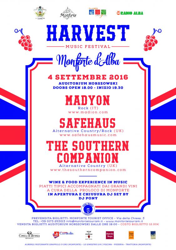 Da un'idea di Silvia Harrison Sibona, nella straordinaria cornice dell’Auditorium Horszowski di Monforte, si terrà domenica 4 Settembre, la prima edizione dell’ Harvest Music Festival: Un bellissimo esempio di scambio culturale per mezzo della musica, che vedrà l’esibizione di due band britanniche e i cuneesi Madyon, freschi di pubblicazione del disco, seguitissimi ed amati dal proprio pubblico, in costante crescita. In apertura e in chiusura dj set a cura di Feel Good Production.Ci sarà anche la Pro loco con il suo stand di piatti tipici accompagnati da grandi vini del territorio. Un’occasione unica per godere dell’affascinante connubio fra musica e gusto.