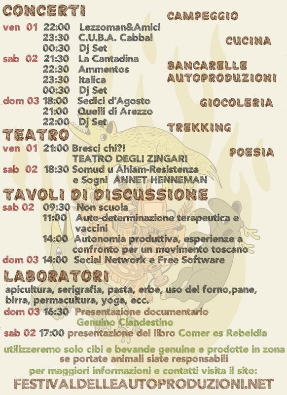 Proponiamo tavoli di discussione in vari ambiti delle autoproduzioni (editoria, educazione, informatica, software libero, agricoltura, edilizia, distribuzione, vaccini); un libero mercatino permanente per chi vuole esporre e vendere ciò che produce; laboratori per imparare ad autoprodurre (birra, pane, contact, orto, serigrafia, sartoria, terra cruda, sapone, api); attività per i bambini, giocoleria, yoga e tai-chi, trekking; concerti, poesia e teatro.