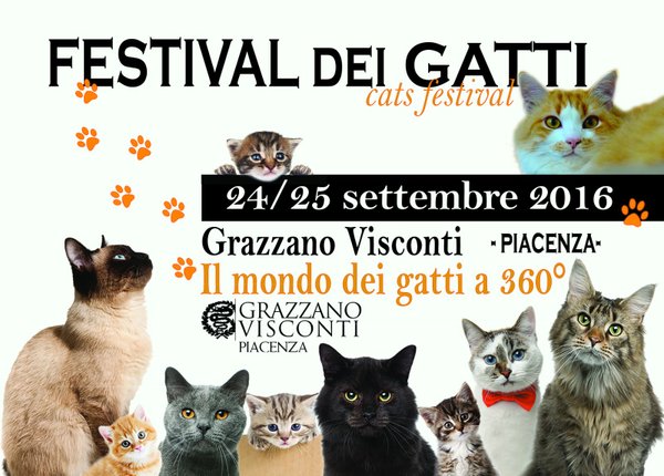 Nei giorni 24/25 settembre nella splendida cornice del Parco del Castello di Grazzano Visconti, in provincia di Piacenza, (www.festivaldeigatti.com) su una superficie di 15 ettari, ovvero 150.000 metri quadrati dedicati ai gatti.