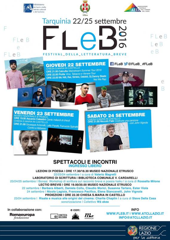 Il Comune di Tarquinia e l’Assessorato alla Cultura e Politiche giovanili della Regione Lazio presentano la seconda edizione del FLeB - Festival della letteratura breve organizzato dall’A.T.C.L – Associazione Teatrale fra i Comuni del Lazio, che si svolgerà dal 22 al 25 settembre 2016 nella splendida cornice di Tarquinia.