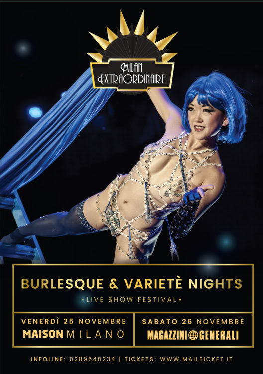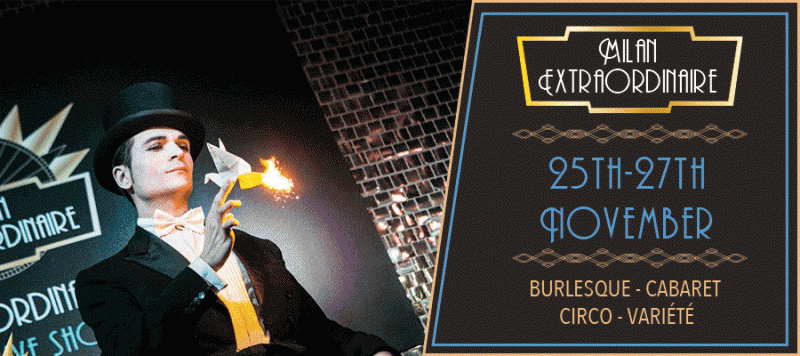Milan Extraordinaire è il primo festival italiano dedicato al live show a 360 gradi: burlesque e boylesque, cabaret, circo, poledance, magia e varietà. Dal 25 al 27 novembre a Milano gli artisti selezionati da una giuria d’eccezione si esibiranno e sfideranno in tre categorie: VARIETY, CIRCUS, BURLESQUE & BOYLESQUE; mentre di giorno workshops, mercatini ed eventi renderanno il weekend unico nel suo genere..una vera celebrazione dell’Arte dell’Intrattenimento in tutte le sue forme.