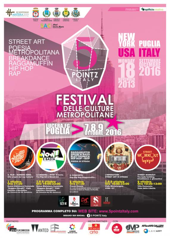 L’evento di Lucera (Fg), come i due precedentemente tenuti, prevede una fitta serie di appuntamenti: talk tematico su street art, graffiti e culture metropolitane, con contributi e testimonianze video da Verona, Milano e Rimini; il film indipendente NUMERO ZERO, narrazione della storia del rap italiano; “WOW! E basta” - la mostra d’arte contemporanea e documentaria sulle poliedriche manifestazioni del fenomeno metropolitano con artisti Pop Art e Street Art tutti pugliesi. Ma ancora presentazione di libri, laboratori street art per ragazzi, concerto metropolitano con esponenti del giovane mondo underground pugliese e naturalmente l’appuntamento con la Street Art, con un omaggio al Mito di Federico Barbarossa, Imperatore del Sacro Romano Impero, che vedrà regalare un primo sito d’intervento urban art in area 167, grazie agli interventi creativi di artisti pugliesi. Al terzo appuntamento di Lucera (Fg), il Progetto 5 POINTZ Italy 2016 farà seguire altre tappe regionali, come quella salentina di Copertino (Le). Ai primi quattro appuntamenti ne seguiranno altri, con date ancora in via di definizione, fino alla chiusura del tour 2016 a dicembre.