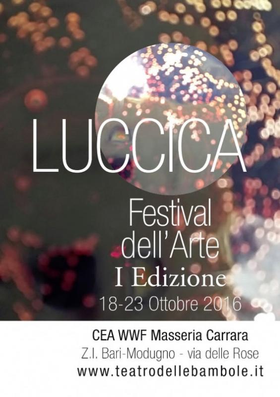 Luccica è un’occasione di aggregazione culturale, un luogo protetto, un’oasi, dove l’Arte viene ad essere di nuovo al centro dell’attenzione. Il Festival, organizzato dal gruppo di ricerca teatrale Teatro delle Bambole e sotto la Direzione Artistica di Andrea Cramarossa, ha come unico sostegno il CEA WWF Masseria Carrara situato in un territorio ai margini - oltre il concetto stesso di periferia - nella Zona Industriale di Bari e di Modugno, tra i quartieri San Paolo di Bari e Cecilia di Modugno in via delle Rose. Per una settimana tutti gli spazi interni ed esterni di Masseria Carrara (compreso l’ampio parco di pertinenza di ulivi e carrubi secolari nel quale sono presenti anche una stalla e un’antica chiesetta) si apriranno per accogliere artisti e pubblico in una rara occasione di incontro e di concentrazione di eventi artistici.