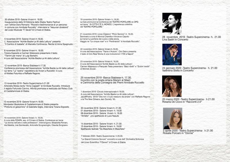 Una festa del teatro, della musica e della poesia. Si rinnova a Castellammare di Stabia l’appuntamento con lo Stabia Teatro Festival – Premio «Annibale Ruccello», che in questa settima edizione si svolgerà in due tranches, la prima dal 30 ottobre al 15 dicembre, e la seconda dal 24 gennaio al 3 aprile.