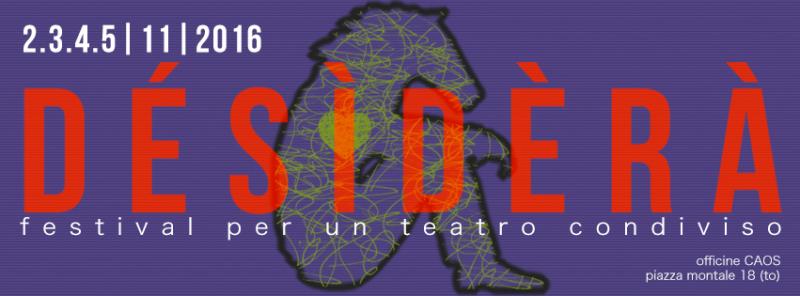 Seconda edizione per il Festival DéSìDéRà, organizzato da Stalker Teatro da mercoledì 2 a sabato 5 novembre 2016 negli spazi delle Officine Caos di piazza Montale 18 a Torino. Il Festival intreccia il teatro d’innovazione e il teatro delle diversità e nasce con l’auspicio, come indica il nome stesso, che particolari esperienze artistiche, per comodità definite performance multidisciplinari, ricevano giusta attenzione e visibilità. Il Festival è infatti dedicato al confronto fra due generi diversi che hanno in comune importanti aspetti della relazione tra spettacolo e società: da esperienze artistiche sviluppate in contesti di emarginazione sociale, dove i linguaggi performativi diventano eccezionali strumenti di relazione fra tutti i cittadini, al rinnovamento delle forme espressive dello spettacolo dal vivo e della ricerca artistica, in costante ascolto delle sensibilità estetiche, etiche e sociali. Nelle quattro giornate del Festival saranno presentati i lavori di otto compagnie in serate multiple: tre locali e cinque provenienti da altre regioni italiane, con nuove produzioni inedite, spettacoli in prima regionale vincitori di premi nazionali e riallestimenti site specific. A completare il programma, una sezione off in apertura di ogni serata (h 20,30) dedicata agli operatori e ai servizi sociali del territorio, che svolgono attività di laboratorio creativo con soggetti svantaggiati.