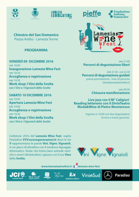 Con il Lamezia Wine Fest, giunto alla V^ edizione, calerà il sipario su questa rassegna che negli anni è cresciuta, coinvolgendo sempre più appassionati di teatro, cinema ed arte, diventando un punto cardine dell'offerta culturale regionale.