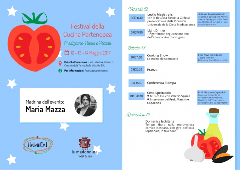 Da venerdì 12 a domenica 14 maggio l'hotel La Madonnina di Ischia ospiterà una kermesse di cucina e stelle: il primo Festival della Cucina Partenopea (Stelle e Stellati). Un accostamento letterale e metaforico che prevede la presenza dello chef stellato Nino Di Costanzo, originario dell'isola, e dell’attrice Maria Mazza come madrina. Con loro, l’astrofisico Massimo Capaccioli, Commendatore della Repubblica e, fino all’anno 2005, direttore dell'Osservatorio Astronomico di Capodimonte e Professore Emerito.
