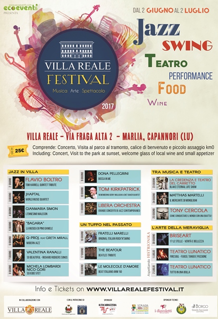 L’antica dimora, appartenuta, tra gli altri, a Elisa Bonaparte Baciocchi, sorella di Napoleone e principessa di Lucca, dopo aver ospitato nel corso della Storia artisti e intellettuali come Salvador Dalì e Alberto Moravia e visto esibirsi al Teatro di Verzura Niccolò Paganini, torna ad aprire i cancelli alle Arti dello Spettacolo per il Villa Reale Festival: 19 serate-evento, 4 contenitori diversi e tanti ospiti. Per il jazz saliranno sul palco, tra gli altri, il grande trombettista Flavio Boltro, tra i rappresentanti italiani più significativi, Tom Kirkpatrick, considerato tra i più importanti musicisti jazz al mondo e Michela Lombardi, tra le prime dieci Migliori Jazz Vocalist Italiane secondo il Jazzit Award 2010. Tra i musicisti anche i Fratelli Marelli, i nipoti diretti di alcuni componenti dell’Orchestrina jazz “Tumbuctu” famosa in Italia durante gli anni ’30 e poi scioltasi con l’arrivo della guerra; i Beafour, la band tribute italiana dei Beatles; Tony Cercola, personaggio cult e grande musicista partenopeo. Per il teatro ospiti, tra gli altri, Matthias Martelli, vincitore, nel 2014, con il suo spettacolo, del Premio Alberto Sordi; il Teatro Lunatico di Bologna, compagnia già ospitata in diversi Festival europei e scelta nel 2012 per l’apertura del carnevale di Venezia e una nuova produzione firmata La Credenza e Teatro del Carretto sulla vita e le opere del poeta maledetto William Blake. Insomma, ce ne sarà davvero per tutti i gusti.