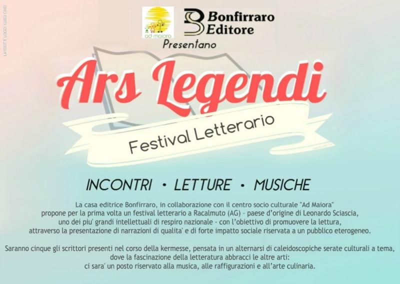 RACALMUTO – A partire dal 21 giugno la città di Racalmuto si trasformerà in un villaggio delle Belle lettere, con incontri, reading, esecuzioni musicali e chicche culinarie… un’attenzione rivolta a tutte le arti al fine di realizzare “Ars Legendi” il primo festival dedicato alla cultura, organizzato e promosso dal centro socio- culturale “Ad Maiora” della presidentessa Maria Mulè e dalla casa editrice Bonfirraro, rappresentata dall’editore Salvo Bonfirraro, da un’idea dell’autrice Mariuccia La Manna.