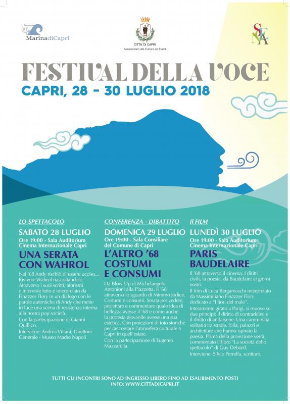 Spettacoli, cinema e dibattiti in diverse location dell'Isola Azzurra sono gli eventi che a partire dal 28 luglio riempiranno l'isola di arte e cultura con la quinta edizione del Festival della voce. La rassegna culturale ideata e promossa da Massimiliano Finazzer Flory, l'attore drammaturgo e regista che interpreterà Leonardo Da Vinci per Rai Cinema nel suo prossimo film, porta in scena a Capri e sul grande schermo miti e personaggi di ieri e di oggi. Il programma del festival della voce a Capri quest'anno annuncia un cartellone di tutto rispetto: durante la prima serata che si terrà nella sala auditorim del Cinema Internazionale sabato28 luglio alle ore 19.00, Finazzer farà rivivere sulla scena Andy Wahrol, l'artista che nel 68' rischio di essere ucciso. Finazzer Flory, in un dialogo con le parole autentiche di Andy, metterà in luce una scena di resistenza interna alla nostra società pop. Domenica 29 luglio alle ore 19.00, a trasformarsi in una platea teatrale sarà la Sala consiliare del Comune di Capri in Piazzetta sul tema "L'altro 68' costumi e consumi ". Da Blow-up, il famoso film di Michelangelo Antonioni alla Piazzetta di Capri, un evento particolare arricchito di proiezioni di foto storiche che raccontano le atmosfere culturali di Capri in quell'estate storica che fu il 1968. Ed infine a chiudere il festival sarà il cinema. Lunedì 30 luglio alle ore 19.00 nella Sala auditorim al Centro Internazionale, sarà proiettato il film Paris Baudelaire, il ’68 attraverso il cinema. I diritti civili, la poesia, da Baudelaire ai giorni nostri. Il film di Luca Bergamaschi interpretato da Massimiliano Finazzer Flory dedicato a “I fiori del male”, interamente girato a Parigi.