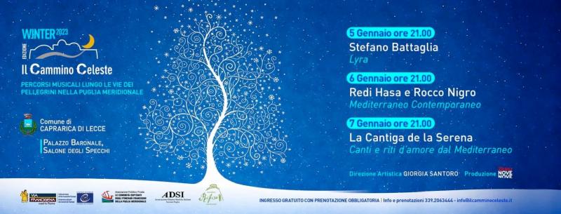 Da giovedì 5 a sabato 7 gennaio (ore 21 - ingresso gratuito con prenotazione obbligatoria info@ilcamminoceelste.it - 3392063444) il Salone degli Specchi del Palazzo Baronale di Caprarica di Lecce ospita "Il Cammino Celeste - Winter". Il Festival, ideato dalla flautista e direttrice artistica Giorgia Santoro e dall'operatore culturale Luigi del Prete, con la produzione di Zero Nove Nove, dal 2016 (con sette edizioni estive e due invernali) propone percorsi musicali e culturali lungo le vie dei pellegrini nella Puglia meridionale in viaggio verso Gerusalemme, con particolare attenzione al tratto che dal porto di Brindisi conduceva fino a Santa Maria di Leuca. Tra gli ospiti il pianista Stefano Battaglia con "Lyra – omaggio a Pier Paolo Pasolini" (giovedì 5), Redi Hasa e Rocco Nigro con "Mediterraneo Contemporaneo" (venerdì 6) e La Cantiga de la Serena con "Canti e riti d’amore dal Mediterraneo" (sabato 7). La "winter edition" è promossa dal Comune di Caprarica di Lecce, in partenariato con Masseria Rifisa, con il patrocinio dell’Associazione europea delle vie francigene e dell'associazione Le Comunità ospitanti degli itinerari Francigeni della Puglia meridionale.
