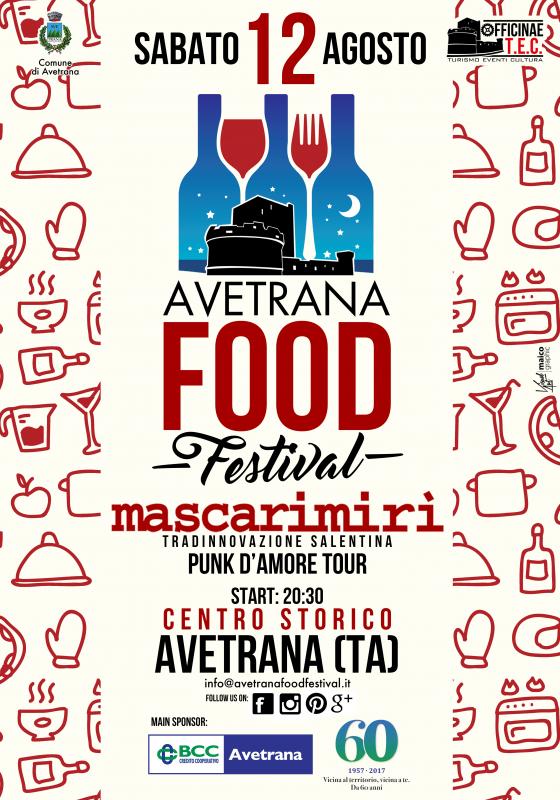 Il centro storico tutto, sarà crocevia di spettacoli, rappresentazioni, mercatini dell’artigianato e degustazioni, showcooking e nondimeno concerti an plein air. La musica infatti sarà come sempre un’altra delle attrattive principali dell’Avetrana Food Festival. Anche quest’anno in programma ben 6 live diversi, 6 band che rappresentano in maniera differente la musica popolare e quella di strada, il cantautorato alla rivisitazione della musica anni 60/70.