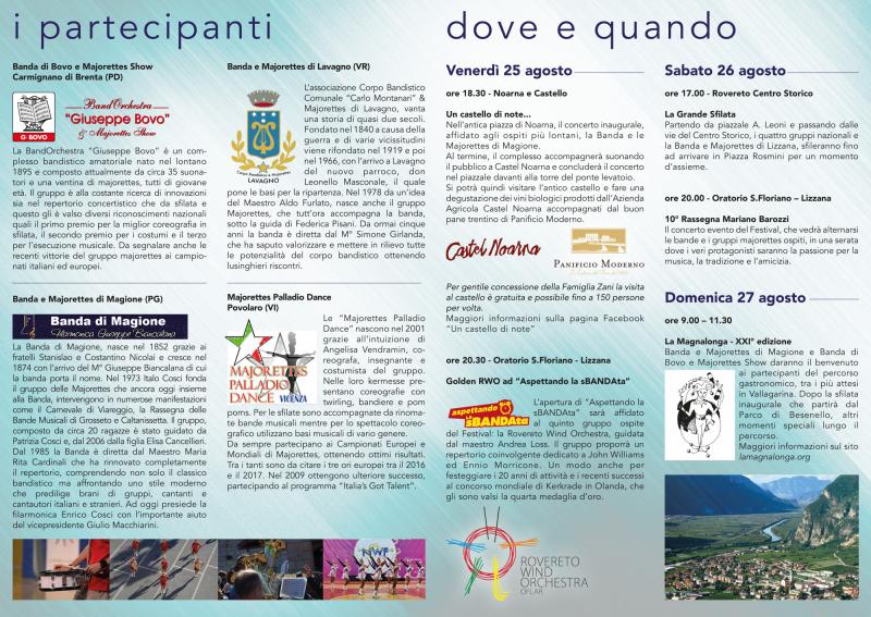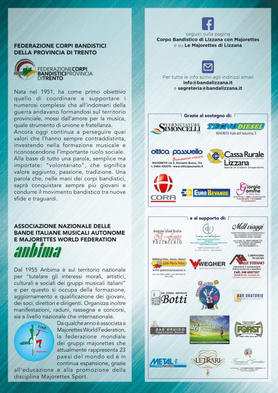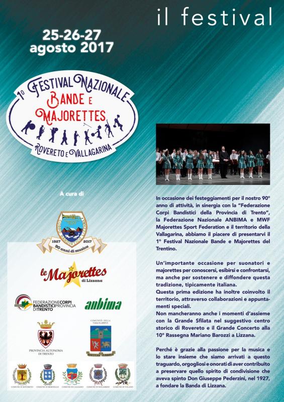 La Banda di Lizzana, organizza a Rovereto per sabato 26 agosto 2017 il 1° Festival Nazionale Bande e Majorettes, che vede la grande sfilata nelle vie del centro storico con partenza alle ore 17.00 da piazza Malfatti e conclusione verso le ore 18.30 in piazza Erbe.