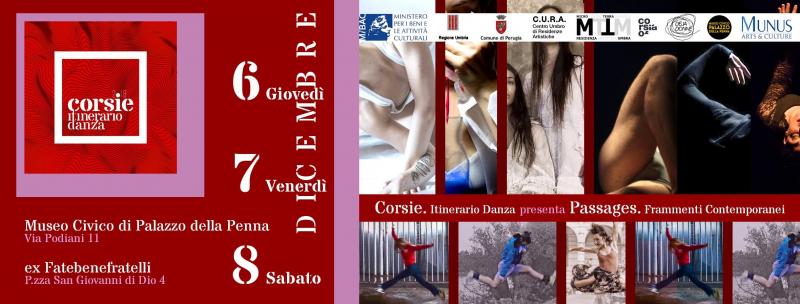 Il programma si articola in due “passaggi” pomeridiani del giovedì e del venerdì, che includono un aperitivo al Bio Art Café di palazzo della Penna, e una performance gratuita nella sala della Collezione Joseph Beuys a Perugia, tre “passaggi” serali, giovedì, venerdì e sabato all’ex Fatebefratelli, e una “deviazione” che immette nel programma di “Passages” una performance che rinnova la collaborazione di Corsia Of con Versiliadanza, altra realtà di spicco nel panorama della danza contemporanea nazionale.