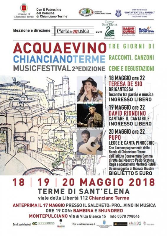 Per il secondo anno consecutivo, dopo il successo della prima edizione, torna Acqua e Vino Chianciano Terme music festival 2° edizione, la manifestazione dove l'acqua, il vino e la musica, tre elementi fondamentali del vivere conviviale, tornano nel ruolo di protagoniste in un festival di musica. Che per questa edizione cambia scenario, non più il grande jazz come per la prima edizione che ha visto la reunion di Banda Sonora con eccellenze quali Enrico Rava, Battista Lena, Gabriele Mirabassi, Gabriele Evangelista e Marcello di Leonardo, ma bensì il teatro canzone e di narrazione.