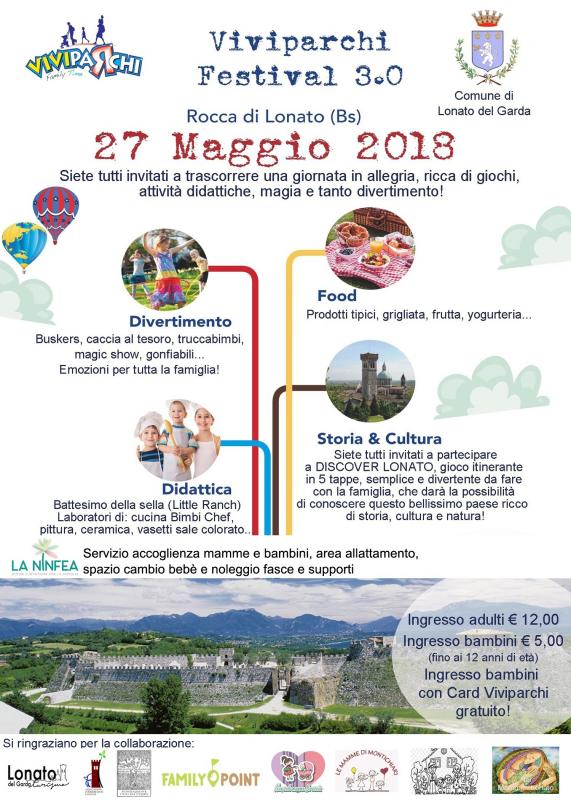 La Rocca viscontea di Lonato ospiterà “Viviparchi Festival 3.0”, domenica 27 maggio, «un evento che trasmette il vero senso del cambiamento nel Dna del circuito e della società Viviparchi – come spiega l’amministratore delegato Saverio Fontana – che passo dopo passo porteranno alla nuova concezione Viviparchi 3.0. La forte condivisione, sia in fase progettuale che di realizzazione con i nostri partner tradizionali, quali parchi associati, gruppi di famiglie e le comunità ospitanti, dà il senso del Progetto Rete che si è voluto creare con la massima attenzione ed efficacia per soddisfare i loro bisogni di ricreazione, fantasia, gioco, didattica e anche di arricchimento culturale delle famiglie, vere protagoniste dei nostri eventi».