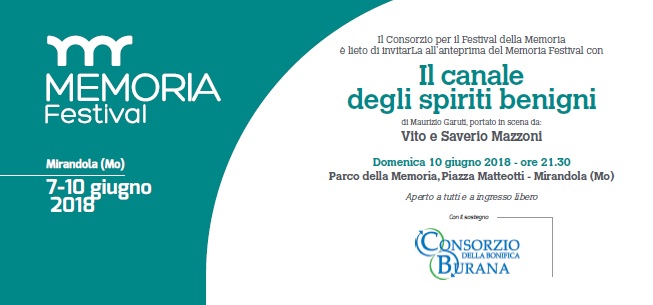 Domenica 10 giugno 2018 alle ore 21,30 presso il Parco della Memoria, Piazza Matteotti - Mirandola (MO) gli attori VITO e SAVERIO MAZZONI porteranno in scena lo spettacolo "Il canale degli spiriti benigni" di Maurizio Garuti.