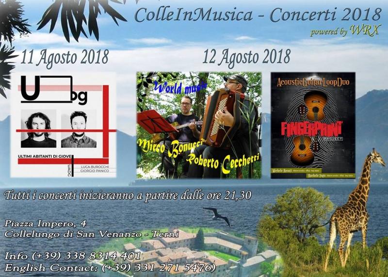 La seconda serata, domenica 12 agosto, si alterneranno le esibizioni del duo composto da Roberto Cecchetti (fisarmonica) e Mirco Bonucci (chitarra), con un repertorio che spazia dai classici italiani al jazz, allo swing, ai vari generi sudamericani passando per la canzone classica napoletana, e del Fingerprint Acoustic Duo composto da Michele Rosati e Rachele Fogu. Assoluta protagonista della performance sarà la chitarra acustica: grazie ad un uso sapiente, rigorosamente live, di effetti elettronici e loop prodotti attraverso il suono delle chitarre, i due musicisti interpretano con arrangiamenti originali, brani scelti senza distinzione di genere o periodo storico.