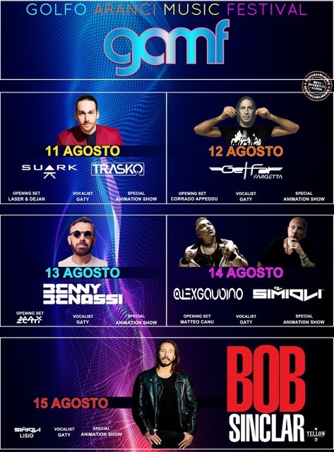 Per la Stagione 2018 in occasione della V Edizione, che si terrà dall’11 al 15 Agosto, il GAMF presenta il dj pop star mondiale Bob Sinclar, artista tra i più famosi al Mondo, che con il brano “Love Generation” è entrato nell’olimpo degli autori e produttori che hanno venduto più dischi nella storia della musica pop, per non parlare della collaborazione con l’Icona Raffaella Carrà, con il remix del brano “A Far l’Amore”, “World Old On” altro successo intramontabile e molti altri… La sua serata al Pachà di Ibiza, “Paris by Night” è in assoluto la più frequentata di tutta l’Isola. Insomma un fuoriclasse che per la prima volta forse al Mondo viene offerto gratuitamente al pubblico, solo ed esclusivamente a Golfo Aranci!
