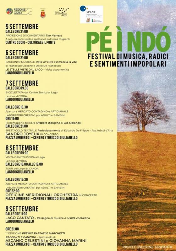 Dal 5 a 9 Settembre, a Giulianello (LT), si terrà la VII edizione del PÈ Ì NDÒ - Festival di Musica, Radici e Sentimenti Impopolari, organizzato col sostegno del Comune di Cori, Rete Di Imprese e SPRAR. Cinque giorni di iniziative ad ingresso gratuito, con al centro la musica ma soprattutto la cultura. Quella della terra, che troverà spazio nel mercato contadino, e quella dei saperi artigianali, da sperimentare all’interno dei tanti laboratori. Gli spettacoli e gli incontri con ospiti nazionali contribuiranno a riempire l’evento di contenuti di valore. Tra le novità una serie di proposte per vivere, scoprire e tutelare il Monumento Naturale Lago di Giulianello.