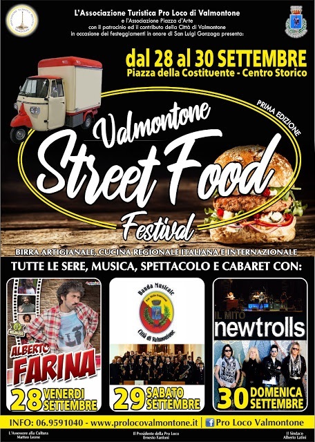 Al via il 28 settembre 2018 a Valmontone (RM) la prima edizione dello Street Food Festival, allestito nelle piazze del centro in occasione della festa patronale in onore di San Luigi Gonzaga. Una prima edizione assoluta per lo Street Food Festival che vedrà in scena, fino al 30 settembre, stand gastronomici con prodotti e piatti esclusivi, il mercatino dell'artigianato e tre serate di musica live e cabaret. Tra i piatti proposti dai truck ci saranno delizie pronte a soddisfare ogni palato, dagli Hamburger di prima scelta, ai primi piatti tipici della tradizione romana (gricia, carbonara, …) e poi, ancora, arrosticini abruzzesi, birra artigianale, pesce fritto, olive all'ascolana, piatti tipici liguri, pollo fritto, panini con la mozzarella di bufala e crema di basilico, degustazioni di formaggi della Ciociaria, piadina romagnola e tante altre leccornie.