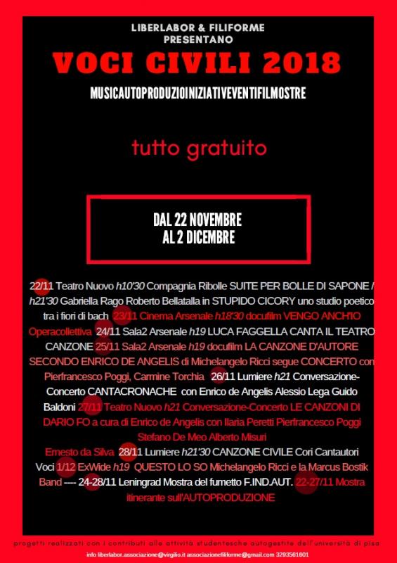 Da giovedì 22 a sabato 1 dicembre 2018 VOCI CIVILI animerà l’autunno pisano con un ricco programma di iniziative, concerti, proiezioni, performance e mostre. Un festival culturale e politico che per una settimana farà dialogare generi e forme artistiche diverse nel costante tentativo di avvicinare un sempre più vasto pubblico alle storie e alle tematiche affrontate.