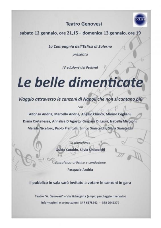 Salerno. Sabato 12 gennaio, alle ore 21.15, e domenica 13 gennaio, alle 19, il sipario del teatro Genovesi a Salerno si aprirà per accogliere sul palco la quarta edizione di “Le Belle dimenticate”. Sebbene il patrimonio poetico e musicale della canzone napoletana sia sterminato, i brani conosciuti dal grande pubblico sono relativamente pochi. Tanti altri, che pure meriterebbero di essere ricordati e cantati, sono eseguiti e ascoltati solo da un’esigua minoranza di appassionati e cultori del genere. L’evento Le belle dimenticate, ideato da Pasquale Andria, che condurrà entrambe le serate in programma al Teatro Genovesi sabato e domenica, tende a riportare all’attenzione alcune di queste canzoni, dodici in tutto, eseguite da altrettanti interpreti: Alfonso e Marcello Andria, Angelo Chirico, Marino Cogliani, Diana Cortellessa, Annalisa D’Agosti, Gaspare Di Lauri, Isabella Micoloni, Marida Niceforo, Paolo Plantulli, Enrico e Silvia Siniscalchi. Il repertorio s’inquadra fra gli ultimi anni dell’Ottocento e la prima metà del Novecento e include molti grandi nomi della tradizione poetica e musicale napoletana: da Salvatore Di Giacomo a Ferdinando Russo, da Libero Bovio a Ernesto Murolo, da E.A. Mario a Michele Galdieri, a De Curtis, D’Annibale, Lama, Valente, ecc. L’accompagnamento al pianoforte è affidato alla bravura e all’esperienza di Guido Cataldo e Silvia Siniscalchi. Il pubblico in sala voterà i brani di volta in volta eseguiti e al termine di ciascuna delle serate saranno premiate le prime tre canzoni classificate.