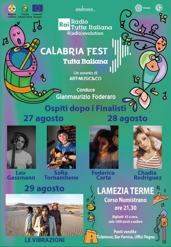 Al via domani sera a Lamezia Terme il “Calabria Fest Tutta Italiana”, il Festival della Nuova Musica Italiana che si svolgerà per tre serate, fino a sabato, sul palcoscenico di corso Numistrano, organizzato da Art-Music&Co, con la collaborazione di Rai Radio Tutta Italiana e il contributo dell’ Assessorato alla Cultura della Regione Calabria, nel quadro degli “Eventi Storicizzati di Rilievo Nazionale”. Il Festival, tra i principali e il più innovativo dedicato alla valorizzazione di giovani talenti, ha anche il Patrocinio di Assomusica (associazione italiana organizzatori e produttori di spettacoli dal vivo), della Direzione Generale della Siae e del Comune di Lamezia Terme.