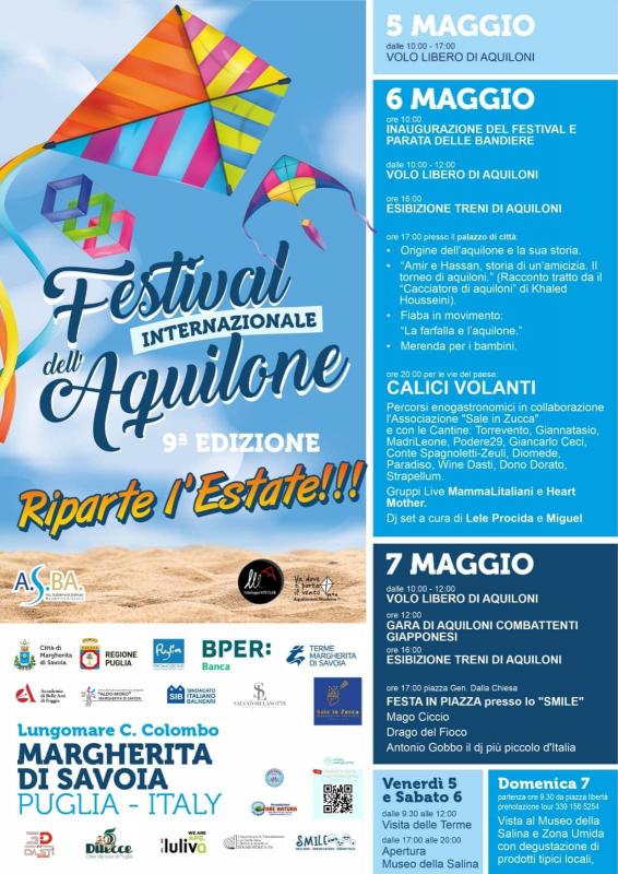 A Margherita di Savoia in provincia di Barletta-Andria-Trani si svolge nei giorni dal 5 al 07 Maggio 2022 la 9a edizione del Festival dell'Aquilone.