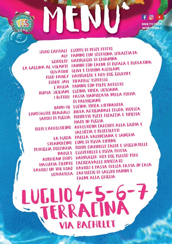 Festival dello Street Food dal 4 al 7 Luglio a Terracina. Via Bachelet sarà travolta dai colori, dal gusto e dal divertimento contagioso tanto da trasformare la splendida Terracina nella capitale del cibo da strada del Mediterraneo. La Typical Truck Street Food ha selezionato per la tappa di Terracina ben 26 Street Chef che all'interno dei loro coloratissimi ristoranti su ruote e roulotte vintage prepareranno il meglio del gourmet on the road.