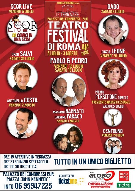 Un brindisi al tramonto per accompagnare il gran finale della kermesse estiva Le Terrazze Teatro Festival al Palazzo dei Congressi, che ha colorato di sorrisi e buonumore questa calda estate. Ultimo week end di programmazione con gli spettacoli di Antonello Costa, il 2 agosto ore 21.30, e l'inedito duo Massimo Bagnato e Carmine Faraco, il 3 agosto ore 21.30. Comicità allo stato puro per il comico siciliano che sul palco si presenta con "E' meglio che faccia da solo", un varietà moderno che propone alcuni dei personaggi che lo hanno reso popolare, tra i quali: Don Antonino lo zio siculo, Sergio il cugino esaurito, Rocco il lookmaker gay, Tony Fasano figlio degli anni 70, Mc Adelio rapper con la zeppola, Raffaello Piombo il cugino calabrese di Tiziano Ferro, il Karacose, il Kitmancula famosa danza russa e il salsero. Tante anche le sorprese e le nuove macchiette, accompagnate da un corpo di ballo e perfomance musicali dello stesso Costa, come Chaplin - Jackson, Totò break. Grande la curiosità attorno al duo Bagnato & Faraco che, per la prima volta insieme, darà vita allo spettacolo "Cabarock", un mix tra la comicità no sense di Bagnato, che rovescia il cliché del comico moderno interagendo con gli spettatori e coinvolgendoli in un viaggio tra monologhi e gag, e quella di Faraco "l'uomo dei Pecchè", un tormentone posto al termine di ogni esibizione canora nella quale canta a voce piena con il pubblico rivisitando i testi delle melodie di celebri cantautori e scatenando l'ilarità generale. Gli spettacoli vanno in scena il venerdì e il sabato alle 21.30, ma dalle ore 19.00 il pubblico può gustare un piacevole aperitivo su uno dei punti panoramici più belli di Roma