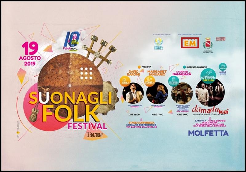 L’associazione culturale Fabulanova, giunta al decimo anno di attività e continuo fermento, presenta la 2° edizione del SuONAGLI Folk Festival con il sostegno, il patrocinio del Comune di Molfetta e l’Assessorato alla Cultura, la Parrocchia San Pio X e il Seminario Regionale.