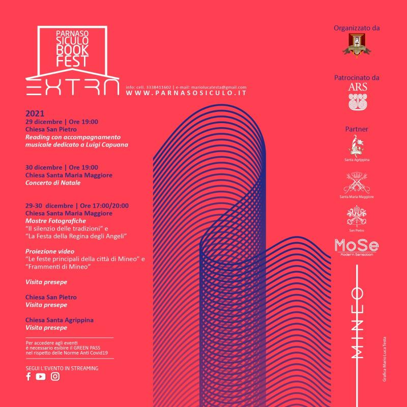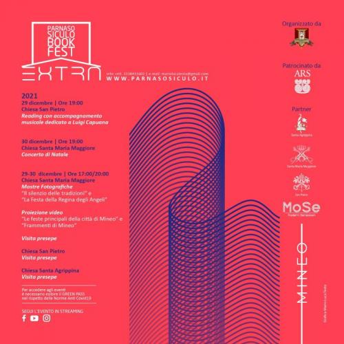 Il “Parnaso Siculo Book Fest - EXTRA” – ideato e diretto da Mario Luca Testa (esperto in Culture Visuali e Progettista Culturale), organizzato dal Circolo “S. Agrippina” e patrocinato dalla Presidenza dell’Assemblea Regionale Siciliana – si terrà a Mineo (CT) il 29 e il 30 dicembre 2021.