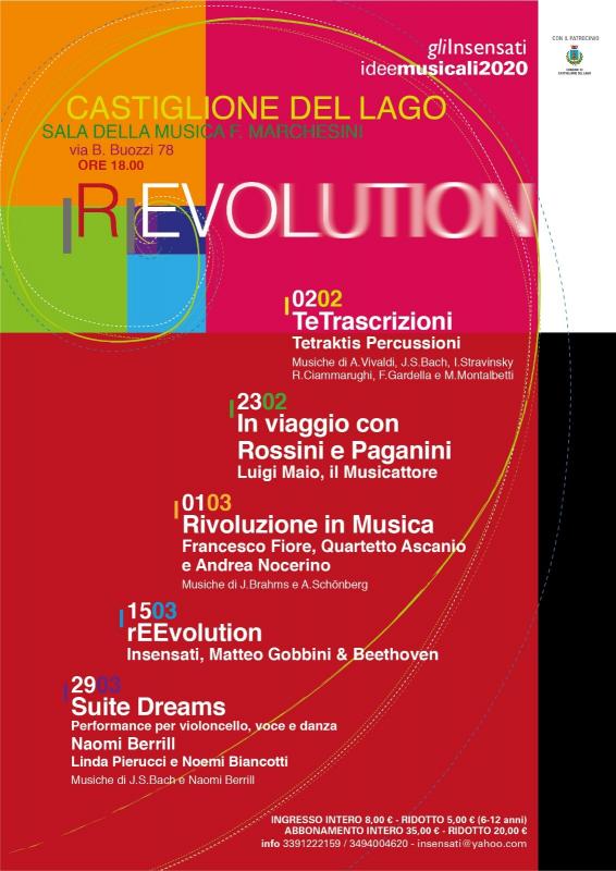[R]evolution è il titolo della terza edizione di ‘Idee Musicali’: l'evoluzione della musica, da Vivaldi a Bach, da Brahms a Stravinsky fino ai compositori contemporanei, ma anche la Rivoluzione, quella di Schönberg, Beethoven (del quale quest'anno ricorre il 250esimo anniversario dalla nascita) e quella interpretativa degli artisti che si avvicenderanno sul palco. La stagione si aprirà il 2 febbraio con le ‘Tetrascrizioni’ di Tetraktis Percussioni, che proporranno brani del repertorio classico e contemporaneo riletti e rivoluzionati per un ensemble di sole percussioni. Il 23 marzo protagonista Luigi Maio, il musicattore, con ‘In viaggio con Rossini e Paganini’, dove si realizza, per mezzo di abili parodie musicali, un’esilarante beffa teatral-cameristica da cui affiorano aspetti didattici e biografico-artistici inediti del compositore marchigiano e del violinista genovese. Il 1 marzo sarà la volta della rivoluzione in musica di Brahms e Schönberg con Francesco Fiore, per venticinque anni prima viola dell’Orchestra del Teatro dell’Opera di Roma, il Quartetto Ascanio e il violoncellista Andrea Nocerino. Il 15 marzo spazio a ‘rEEvolution’, l'omaggio de Gli Insensati e del pianista Matteo Gobbini a Beethoven. Il 29 marzo in programma ‘Suite dreams’, performance per violoncello, voce e danza della violoncellista Naomi Berrill con le ballerine Linda Pierucci e Noemi Biancotti. Tutti i concerti si svolgeranno presso la Sala della Musica "F. Marchesini" in via B. Buozzi 78 alle ore 18.