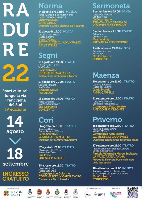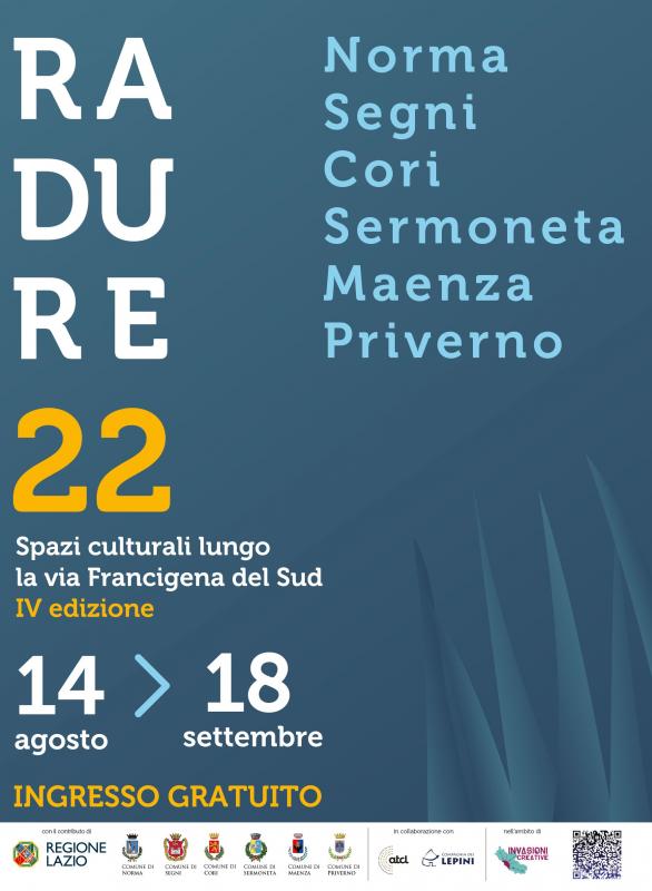 Giunge alla sua quarta edizione Radure. Spazi culturali lungo la Via Francigena del Sud a cura dei Comuni di Priverno (capofila), Norma, Segni, Cori, Sermoneta e Maenza grazie al contributo della Regione Lazio e nell’ambito del progetto integrato Invasioni Creative di ATCL – Associazione Teatrale fra i Comuni del Lazio, in collaborazione con la Compagnia dei Lepini, primo festival di valorizzazione del patrimonio culturale del sistema territoriale dei Monti Lepini, dedicato ai luoghi della cultura attraversati dal cammino spirituale della Via Francigena del Sud. Dal 2019 Radure rappresenta la proposta culturale d’eccellenza per promuovere il territorio e rilanciarne l’immagine, attraverso la commistione tra le arti dello spettacolo dal vivo, le identità dei luoghi e la partecipazione attiva delle realtà operanti in questi splendidi Comuni.