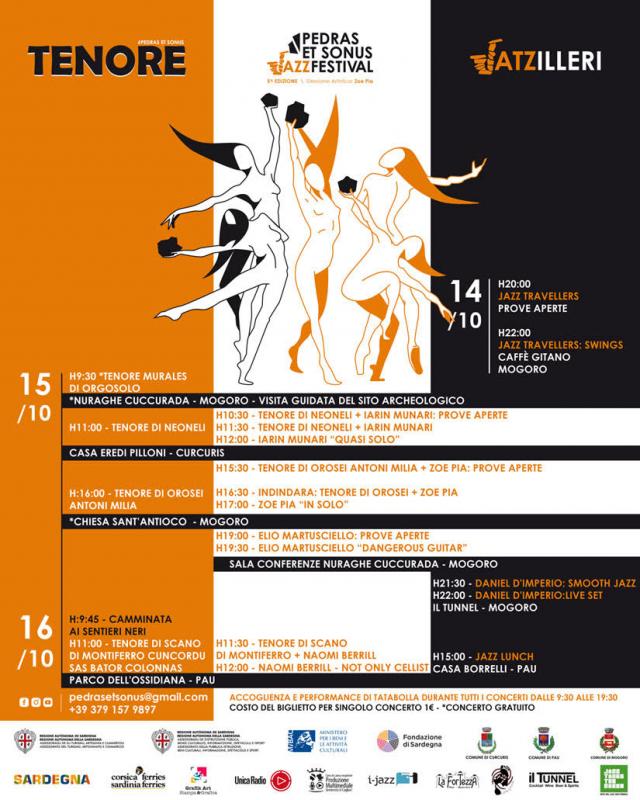 Il giorno dopo (sabato 15 ottobre) alle 9.30 presso il Nuraghe Cuccurada di Mogoro la giornata del festival si aprirà con l’accoglienza per i più piccoli affidata all’animatrice Tatabolla, che introdurrà i partecipanti alla visita guidata nel sito archeologico. Durante il cammino e una volta giunti a destinazione, il canto del Tenore Murales di Orgosolo – con Franco Corrias (boghe), Cosimo Mureddu (bassu), Maurizio Bassu (contra) e Salvatore Musina (mesu boghe) - accompagnerà i visitatori alla scoperta del monumento millenario. Un’ora più tardi (alle 10.30) presso la Casa Eredi Pilloni di Curcuris si terranno tre appuntamenti (preceduti come avvenuto nel giorno precedente dalle prove aperte), che vedranno in successione il concerto del Tenore di Neoneli – con Tonino Cau (bassu), Peppeloisu Piras (boghe), Ivo Marras (mesu boghe), Roberto Dessì (contra) e Angelo Piras (boghe) -, che poi incontrerà musicalmente il batterista e compositore Iarin Munari, impegnato infine con il suo concerto intitolato “Quasi solo”. Per la prima volta i progetti del festival risuoneranno in un’architettura storica sacrale, in un trittico geometrico che illumina e valorizza il Canto a Tenore, il musicista in solo e l’incontro ancestrale tra i due paesaggi sonori creati dagli artisti. Gli appuntamenti della giornata continueranno nel pomeriggio nella Chiesa di Sant’Antioco a Mogoro con tre concerti sul modello di quelli proposti nella mattinata: alle 15.30 il primo a esibirsi sarà il Tenore di Orosei “Antoni Milia” – con Tore Mula (voche), Alessandro Contu (basso), Ivan Sannai (cronta), Francesco Mula (mesu voche) - successivamente impegnato con la clarinettista mogorese Zoe Pia nel concerto Indindara (nato la scorsa estate nell’ambito del Cala Gonone Jazz Festival): un’immersione sonora nel respiro ancestrale dell’isola, un flusso vitale tra l’arcaico, il sacrale, l’avanguardia e la creazione estemporanea verso l’opportunità di un viaggio conoscitivo delle intime aspirazioni dell’uomo e del suo rapporto con la vita. Zoe Pia si esibirà successivamente con il suo progetto “In solo”, punto di partenza dove si incontrano le launeddas - in veste completamente personale e dai timbri inesplorati grazie all'utilizzo dell’elettronica -, il clarinetto con loopstation, i campanacci sardi e pezzi di artigianato artistico di Maestrodascia di Ales e di Ariu ceramiche di Mogoro. Alle 19 il festival Pedras et Sonus si trasferirà presso la Sala Conferenze del Nuraghe Cuccurada, per il concerto Dangerous guitar del musicista e compositore sperimentale Elio Martusciello (preceduto dalle prove aperte). L’estetica musicale di Martusciello deriva essenzialmente dall'arte acusmatica, arricchita da composizioni per strumenti e live electronics, opera installazioni d'arte, dei multimedia, delle arti visive e dell'improvvisazione elettroacustica. A chiudere la intensa giornata del festival ci penserà in serata il chitarrista Daniel D’Imperio: alle 21.30 (preceduto dalle prove aperte) presso il locale Il Tunnel di Mogoro, l’artista di Rovigo si esibirà con il progetto Smooth Jazz.