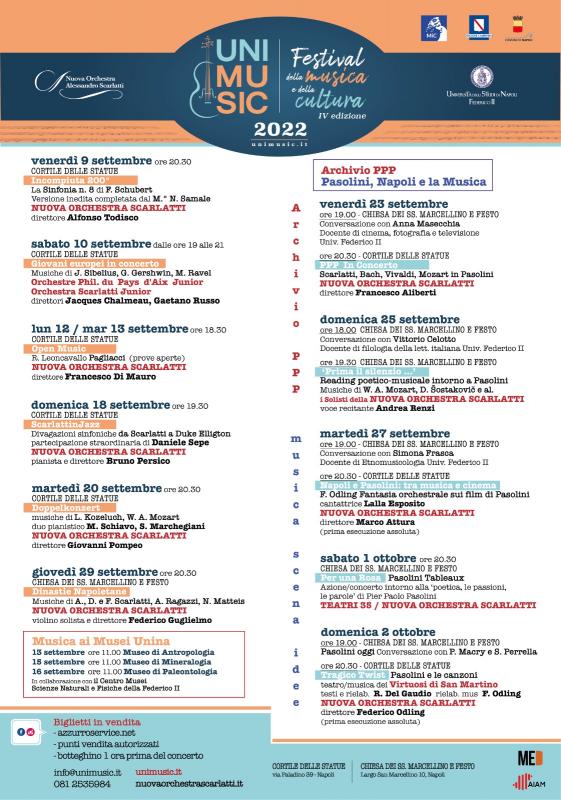 Martedì 27 settembre, San Marcellino ore 19.00: conversazione con Simona Frasca, docente di etnomusicologia presso la Federico II; Cortile delle Statue ore 20.30: prima esecuzione assoluta di una Fantasia orchestrale su temi dalle colonne sonore del cinema pasoliniano di Federico Odling, con la partecipazione della ‘cantattrice’ Lalla Esposito.