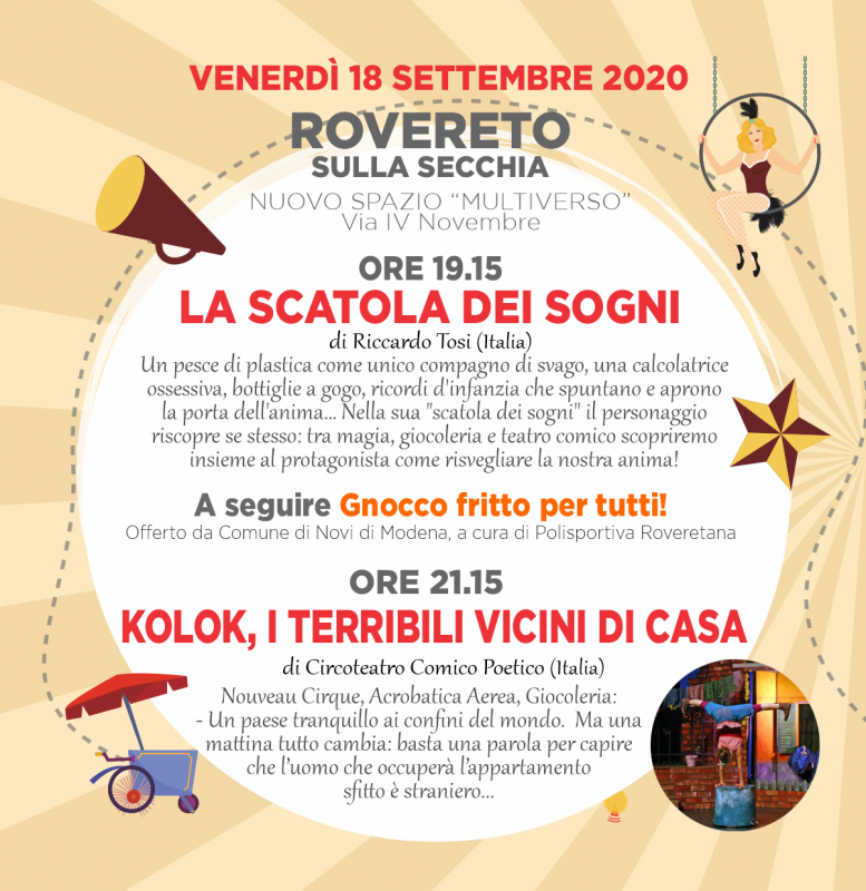 Ritorna il 18, 19, 20 Settembre 2020 a Novi di Modena lo STRAVAGANTE STREET FESTIVAL. Magia, giocoleria, trasformismo, degustazioni e altro ancora per la seconda edizione della rassegna dedicata al teatro ed al cibo di strada.