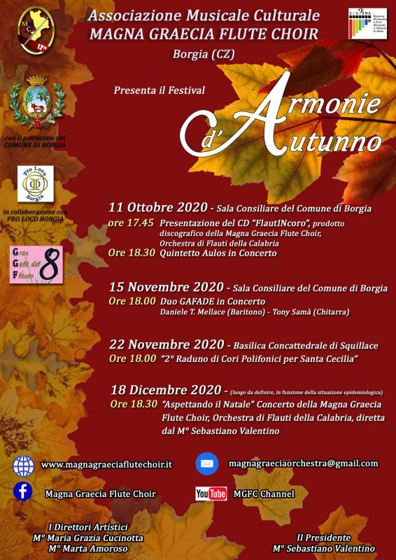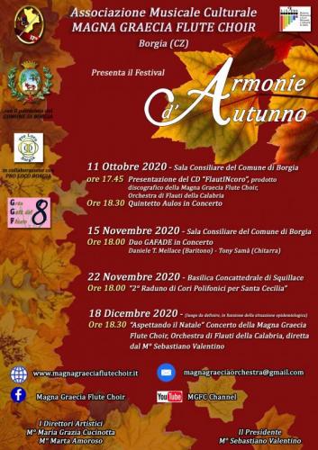 L'evento fa parte del festival ARMONIE D'AUTUNNO organizzato dall'associazione a cui fa capo l'orchestra di flauti con il patrocinio dell'amministrazione comunale di Borgia, sempre attenta e disponibile a valorizzare le realtà culturali locali. il festival proseguirà poi a novembre con un concerto per baritono e chitarra del DUO GAFADE (il 15), il 2° Raduno di Cori Polifonici per Santa Cecilia presso la Basilica Concattedrale di Squillace (il 22) e il concerto pre natalizio con l'orchestra di flauti della Calabria Magna Graecia Flute Choir a Borgia (il 18).