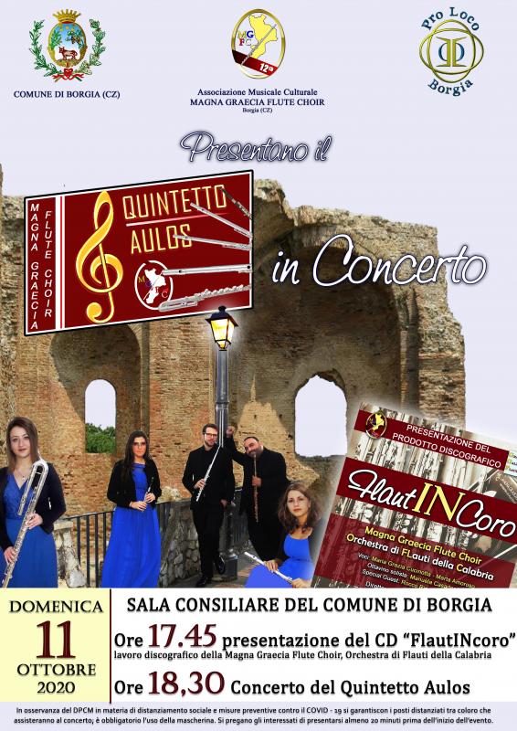 L'evento avrà luogo domenica 11 ottobre p.v. alle ore 17.45 presso la SALA CONSILIARE del COMUNE DI BORGIA (CZ) e sarà seguito dal concerto del quintetto di flauti AULOS, altra formazione derivante dalla Magna Graecia Flute Choir, con protagonisti il direttore e fondatore del gruppo, SEBASTIANO VALENTINO, nel ruolo di 1° flauto, e dei componenti ASIA GUERRISI, VERONICA ROMEO (flauti), GIULIA CURCIO (flauto contralto) LORELLA ESPOSITO (flauto basso).